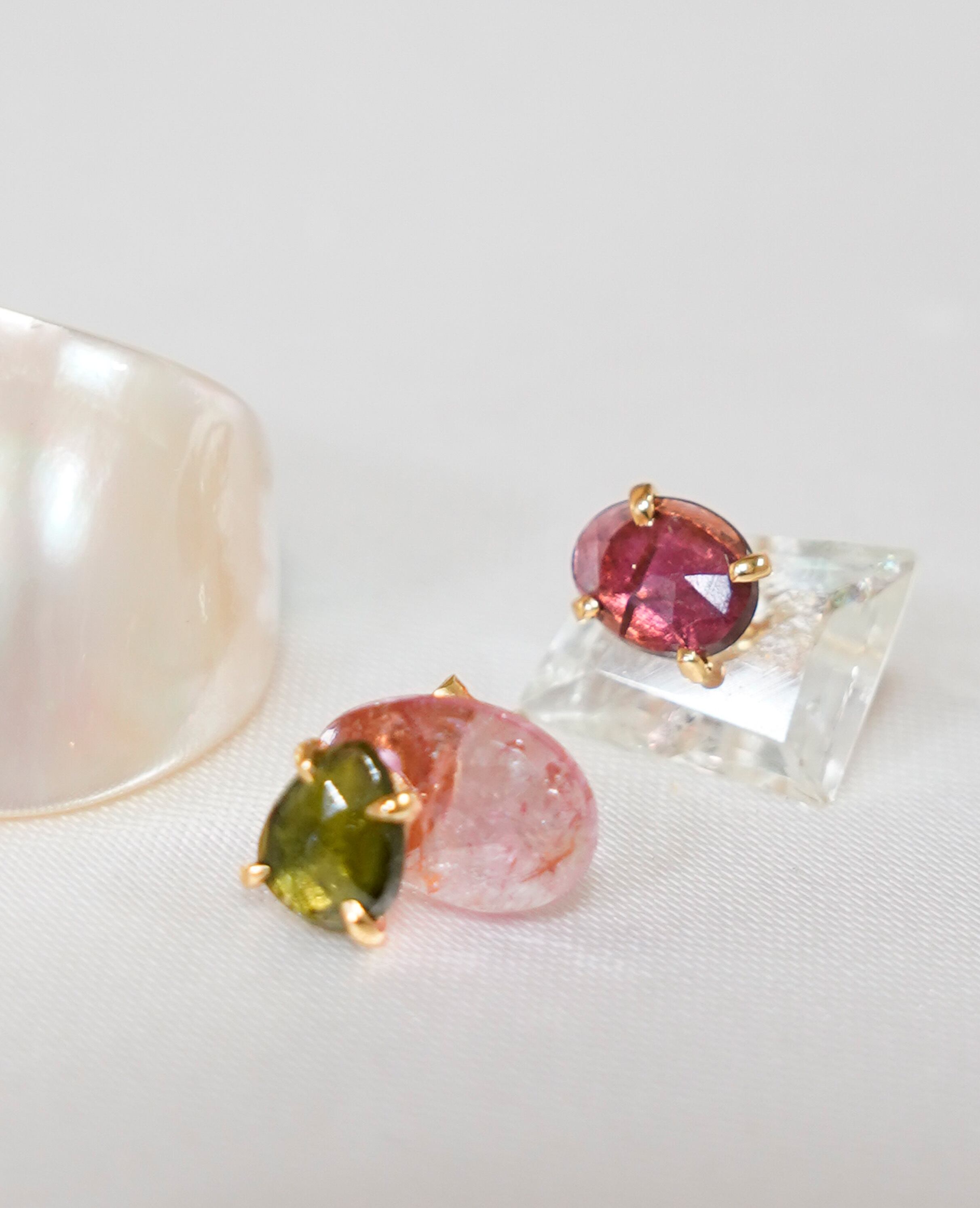 石留めしたグリーントルマリンとピンクトルマリンの組み合わせ